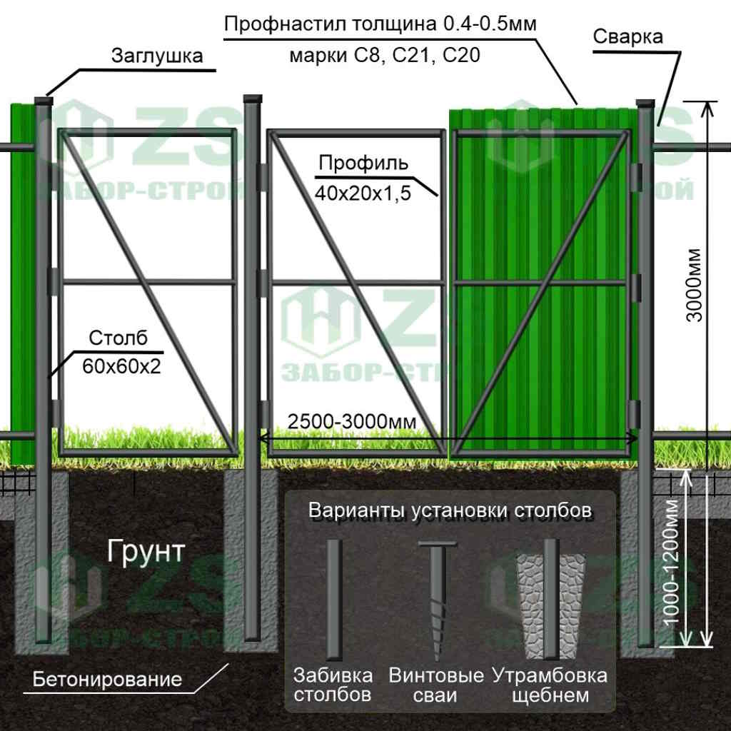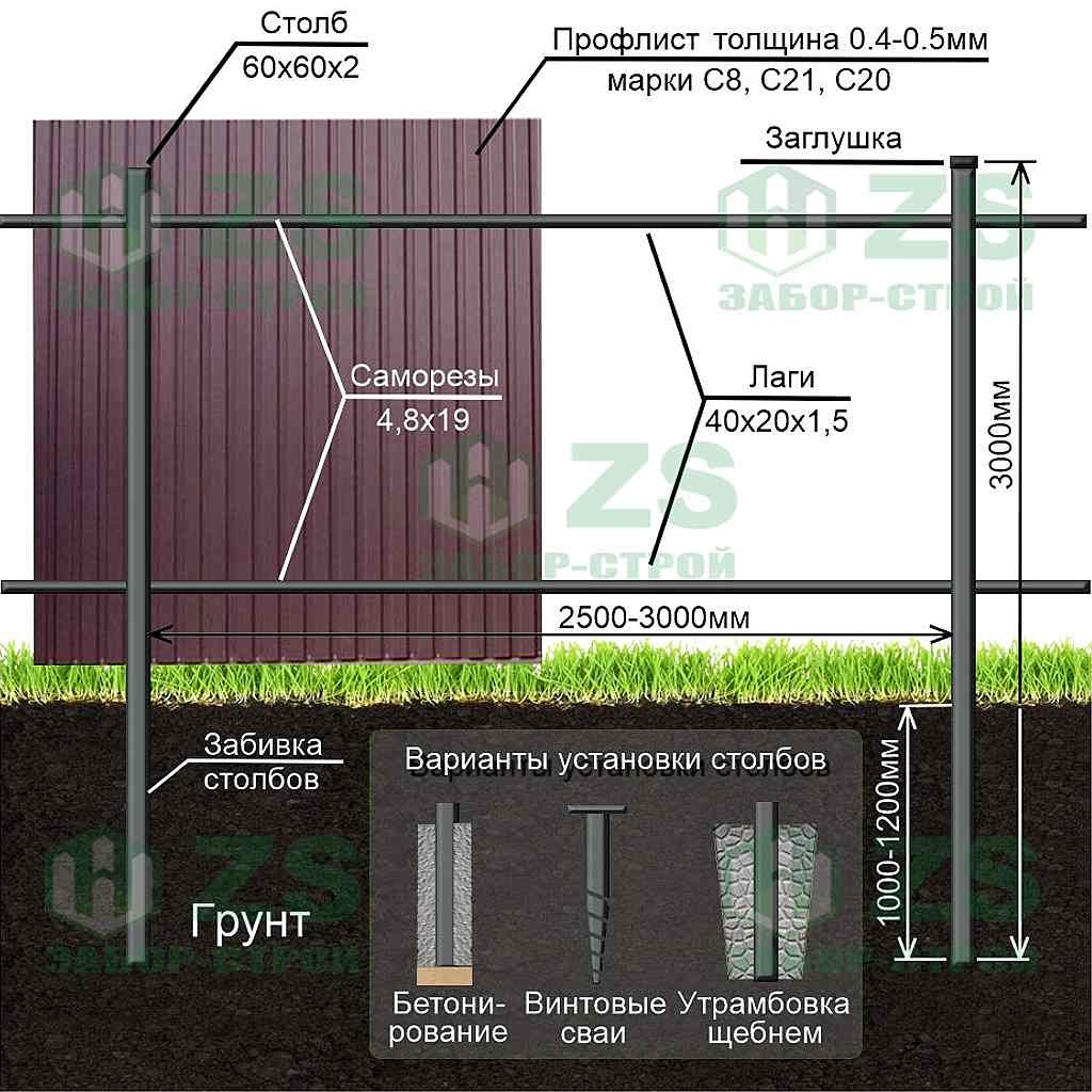 Забор из профнастила С8 или С20 толщиной листа 0,5 мм. с установкой: