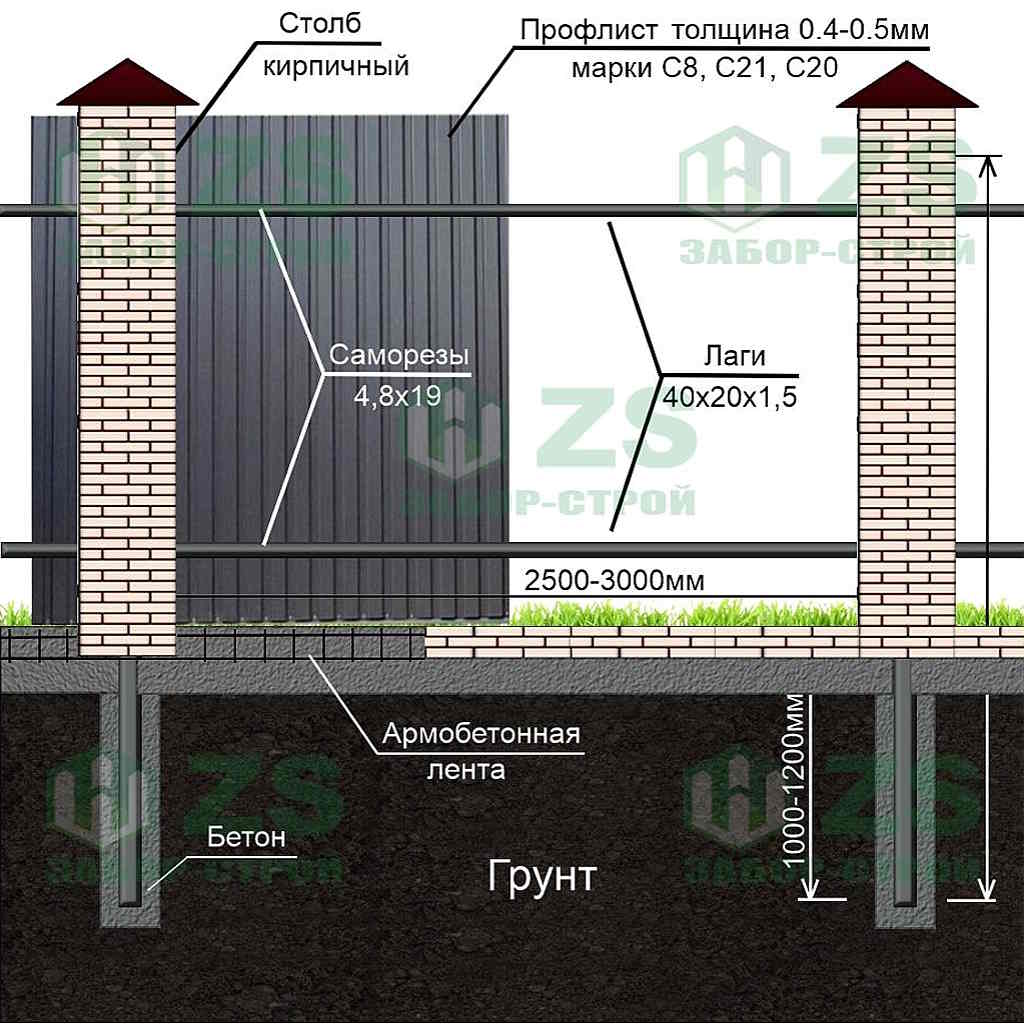 Конструкция забора на ленточном фундаменте с кирпичными столбами: