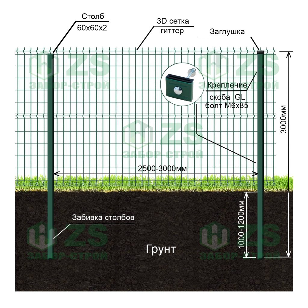 Сварной забор 3Д GL панели ячейка 200х55 (на крашеных столбах 60x60):